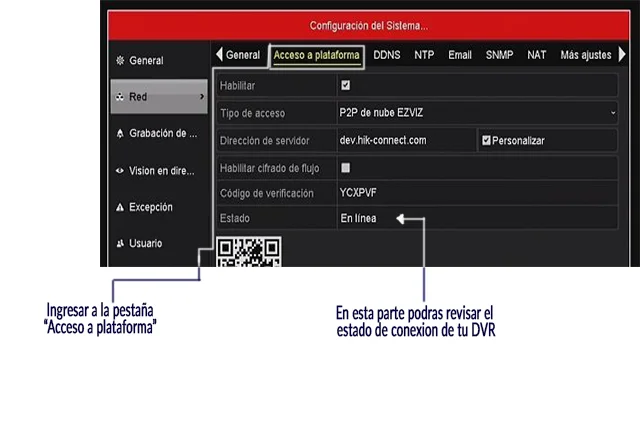 Una vez que nuestro dispositivo se ha reiniciado correctamente, podremos revisar si la conexión se ha establecido con éxito, para ello seguiremos la siguiente ruta: “Menú” → “Configuración” → “Red” y una vez dentro de esta opción, ingresaremos a la pestaña “Acceso a Plataforma” una vez que te encuentres en esta opción, al final de la sección encontraras la opción de “Estado” y te aparecerá en línea.