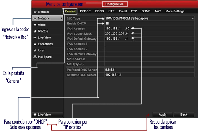 Una vez que has recopilado los datos de la red, es hora de ingresarlos a tu DVR, empezando por desactivar “DHCP” para poder ingresar una dirección IP estática, ingresa los datos en el siguiente orden: