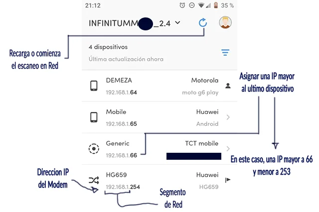 - 7.4 – Recarga la app para obtener los datos de los dispositivos en la red, lo cual puedes hacer desde el icono en la parte superior derecha, una vez que se ha terminado el escaneo te aparecerá la lista de dispositivos con sus respectivas direcciones IP, tal como se muestra en la imagen anterior.