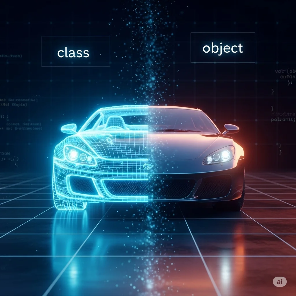 Ahora, una vez que tienes el plano, puedes usarlo para construir un coche real, o diez, o mil. Cada uno de esos coches físicos, construidos a partir de tu plano, es un objeto. Todos comparten la misma estructura definida en el plano, pero cada uno es una entidad única con sus propias características (uno puede ser rojo, otro azul; uno puede tener el tanque lleno y otro vacío).